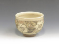 繊細な椿模様を線彫りで装飾した温かい土味溢れる雰囲気の貫入ぐい呑!